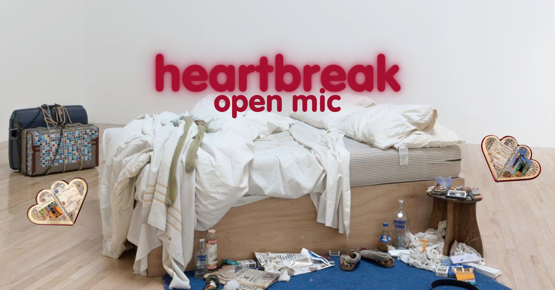Grief is often expected to be experienced in private. We want to feel out feels together, in public, at this open mic. We can share about heart-break in different arenas of our life: political, familial, platonic, romantic, with ourselves, with social movements… What kind of heartbreak do you want to share? All heartbreak is welcome in this space. You can also submit an anonymous text to one of our hosts so they can read it out. In the last 10 minutes we will close off the night collectively by sharing ways of caring for our broken hearts [mending heart emoji].